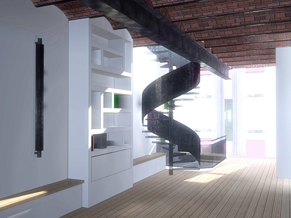 L’espace de vie principal fait 86 m² au sol et a une hauteur sous plafond de 3,8 m. Par conséquent, il a fallu réaffirmer les différents sous-espaces afin de créer une organisation spatiale lisible, claire et fluide. Les ambiances lumineuses, le dessin des aménagements, les couleurs, le traitement des surfaces et les matériaux ont fait l’objet d’une attention particulière afin qu’ils favorisent la sensation de confort et la luminosité. Les éléments directeurs de cet aménagement sont la bibliothèque éclairée et le banc sur toute la longueur de l’espace, ils permettent de mettre en valeur les éléments décoratifs et de lier l’ensemble des fonctions.