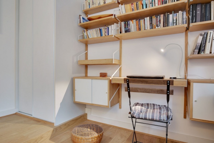 Au rez-de-jardin, l’intervention principale concerne les 3 chambres. Le parquet flottant en mauvais état est rénové, le jonc de mer de la chambre d’ami est remplacé par un parquet contemporain. Le travertin de l’entrée et du couloir, est conservé compte tenu de son état impeccable. Un accès direct entre la maison et le garage est créé à la place du placard existant.