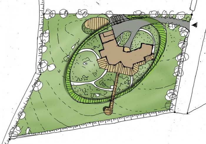 Dans la deuxième proposition ( Jardin d'ellipse), le principe est la définition et l’appréhension d’un paysage structuré approché limité par une ondoyance végétale laissant le reste du terrain à l’état sauvage raisonné. Cette différence entre les deux types de végétations est reliée par une passerelle décollée du sol menant à une plateforme belvédère permettant de profiter pleinement de la vue magistrale sur les Pyrénées en s’affranchissant de l’emprise de la maison.