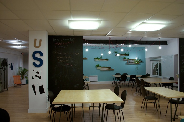 C’est un lieu de convivialité qui regroupe travail, sérieux et concentration, mais aussi joie et détente. L’utilisation des couleurs vives et le style hétéroclite des mobiliers se rapportent directement à l’esprit du camping, et amène une ambiance agréable pour pouvoir travailler sereinement.