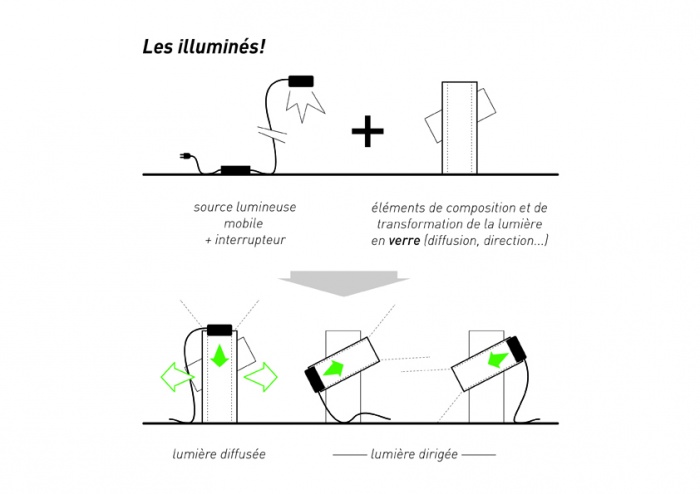 (...) : " Le programme : Décomposer le luminaire traditionnel en deux éléments distincts, une source mobile (led) et un ensemble d’éléments de composition et de transformation de la lumière (en verre). Désormais, la source n’est plus contrainte par un ensemble mécanique pour se rendre multi-fonctionnel. En collaboration directe avec l’utilisateur, elle se déplace simplement d’un élément à un autre (tubes en verre) et utilise leurs finitions (sablé, opaque, taillé...) pour se rendre justement utile. "