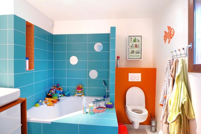 L'aménagement intérieur s'organise autour d'un "coeur" double hauteur, traversé par un escalier et une passerelle, squelettes de verre et d'acier. La cuisine/salle à manger s'ouvre sur la terrasse au Sud, tandis que le salon offre un cocon plus intime, sous la mezzanine. L'étage est réservé aux enfants : le coin "jeux" s'ouvre sur la double hauteur, et répartit les chambres et la salle de bain sans effet de couloir.