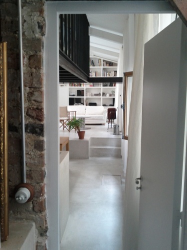 Transformation d’un Atelier d’une sculptrice en loft d’habitation de 50 m² à Paris 20. -Trois mètres cinquante de large sur treize mètres de long et quatre mètres de haut, c`est dans cet espace tout en longueur et en hauteur, qu`il a fallu recrée r un lieu à vivre. Ancien petit atelier d`artiste situé à rez de chaussé dans une typique cour parisienne du 20éme arrondissement,il a fallu lui donner une fonction qu`il n`avait jamais connu : être habité. Casser la sensation de longueur, profiter du grand volume, prendre de la hauteur, alors que l`espace semble désespérément plat: il a fallu creuser pour mieux se surélever en créant 3 démi-niveaux, chacun avec une fonction et une hauteur: -la chambre,dominante, petit théâtre de verre suspendue , offre un aspect ludique, par sa totale transparence: Sa structure tout en acier sur six mètres de long, et son vitrage type ancien atelier lui confèrent solidité, et légèreté, portée sur deux appuis. – La cuisine est en réalité un escalier meuble habité. les élements viennent se réfugier sous les marches afin d`optimiser les rangements. Le plan de travail, massif, en béton brut vient confirmer son statut. – le salon à mi hauteur offre toute la perspective du lieu, rendu possible par la transparence de la chambre. Aucun obstacle à la profondeur. La salle de bain “mosaiquée” sol, mur, plafond, donne une sensation Hammam, détente. Toujours dans l`esprit de supprimer toutes barrières visuelles, la douche à l`italienne ne fait q`un avec le sol. -La façade a été entièrement réhabilitée en conservant le rythme des menuiseries bois atelier de l`époque. Lorsque cela a été possible, chaque mur, chaque élément structurel a été mis à nu, ainsi que les matériaux . Le béton, l`acier, le bois, le verre la brique et la pierre sont révélés dans ce petit volume parisien.