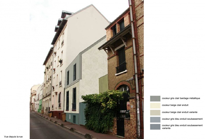 Le choix des matériaux s’est fait dans un souci de cohérence avec le caractère ouvrier du quartier (logements collectifs, maisons individuelles, anciennes usines), et plus particulièrement au passé de la maison, tout en ne cherchant pas toutefois à imiter, mais à mettre en valeur et différencier les différentes phases d’évolution du bâtiment.