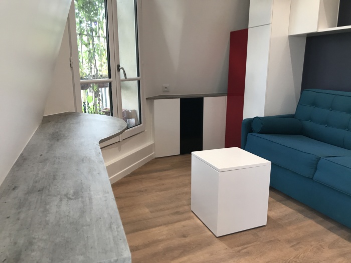 Rénovation d'un studio. Projet sur mesure pour petites surfaces. Fonctionnalité, design mobilier de rangement. Eléments modulables.