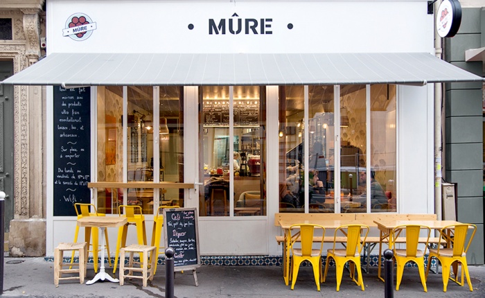 .. Celle ci reprend le code des tables à plateau brut sur pieds de bistrot repeint en blanc pour le clin d’œil baroque. Mais plus cosy, les murs se voient doté d'un joli papier peint, et de belles banquettes tapissées sur mesure. Les suspensions bois et métal laqué blanc se fondent parfaitement dans l'univers coffee shop de Mûre. La devanture a totalement été refaite de manière à pouvoir s'ouvrir intégralement sur toute la longueur du restaurant avec ses "fenêtres gigantesques". Le blanc pour la fraicheur, le renouveau, et un choix de mobilier terrasse repeint en jaune chaud donne l'identité visuelle et commerciale en façade.