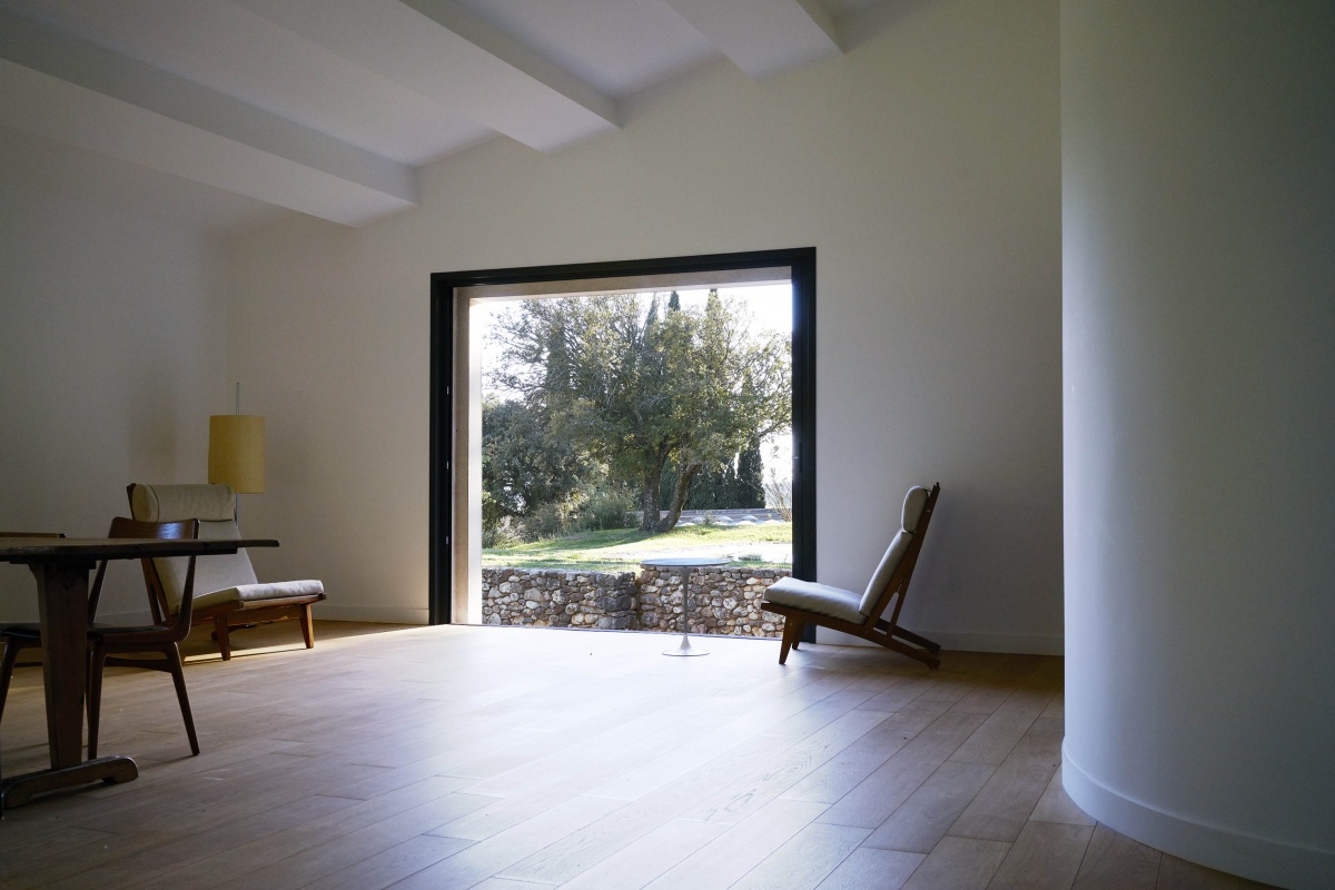 Au-dessus d’une ancienne bergerie, sombre volume entaillé de petites ouvertures dans d’épais murs de pierres, il y avait la grange et l’odeur chaude du foin. Cet espace, qui abritait le berger et sa moisson, a été rénové en un loft pour accueillir une ancienne citadine. Le volume, après dépose des petites cloisons, se révèle ample et généreux. Comment concilier cette envie de garder un espace haut et libre avec le besoin de séparer certains usages privés (dormir, se laver) de la grande pièce commune ? A l’évidence, en créant des passages singuliers et des perspectives donnant sur l’extérieur. Dans ce loft, on circule avec calme et douceur, envahi par une atmosphère ronde s’inspirant de la géométrie organique des arbres du parc environnant : les parois se courbent, se laissant enlacer par un escalier qui mène à l’étage des mezzanines ; elles fabriquent également un volume de rangement dans le volume de la grande pièce, au détour duquel se loge une cuisine épurée et ultra fonctionnelle. La face concave de ces parois confère aux espaces intimes, et plus particulièrement aux chambres, un sentiment enveloppant, doux et voluptueux, tout en permettant d’y adosser du mobilier en placage bouleau dessiné sur mesure (bureau, étagères et penderie). La face convexe rend l’espace fluide et l’ouvre vers les nouvelles ouvertures composées chacune d’un coulissant unique à galandage. Ces larges baies se succèdent comme dans un travelling allant du platane centenaire vers un bassin qui reflète la lumière du crépuscule jusqu’à l’intérieur du loft.